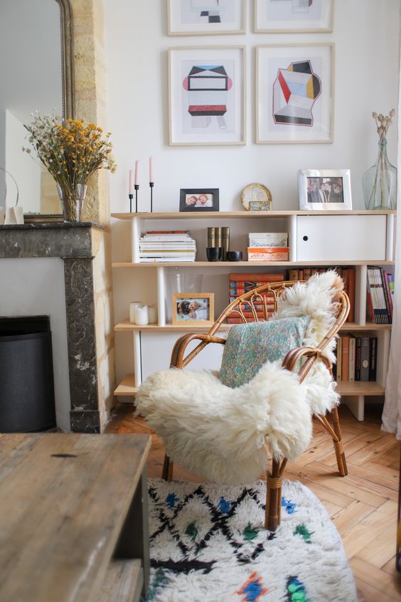 Les fauteuils en rotin sont très tendances depuis quelques années, mais soyons honnêtes : ils ne sont pas toujours confortables. Si vous avez envie de l’utiliser pour lire un bon livre, rendez-le plus confortable avec une peau épaisse ainsi qu’un gros coussin moelleux.