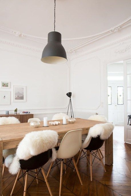 Sur des chaises scandinaves très classiques (de type Eames), installez des peaux de mouton pour rendre l’assise plus confortable et moins froide, surtout l’hiver. Cette assise confortable donnera envie à toute la famille de rester plus longtemps à table pendant les repas, tout en ajoutant une note cocooning à cette pièce souvent peu utilisée.