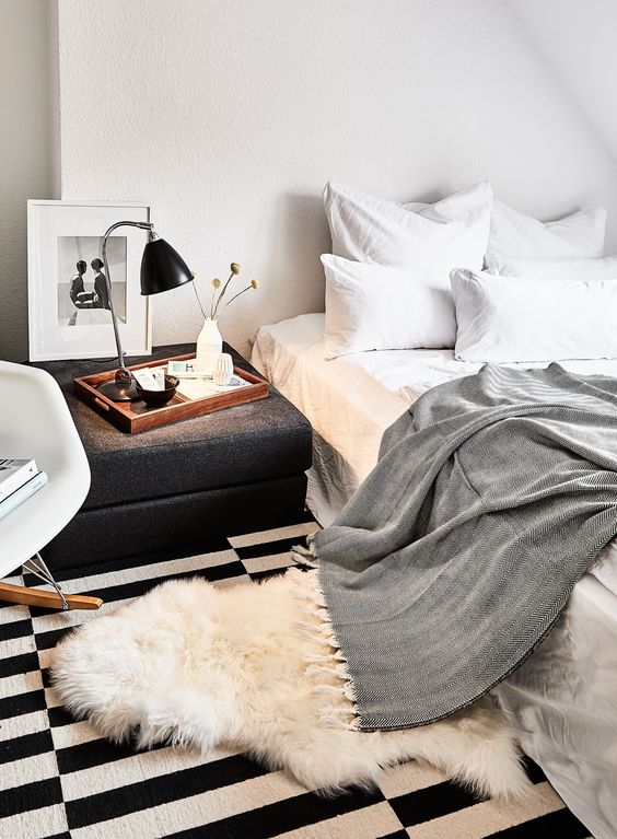 Rien ne vous empêche d’ajouter une peau de mouton dans une décoration déjà existante. Ici, la peau de mouton apporte une touche scandinave et cocooning à une chambre de style rétro.
