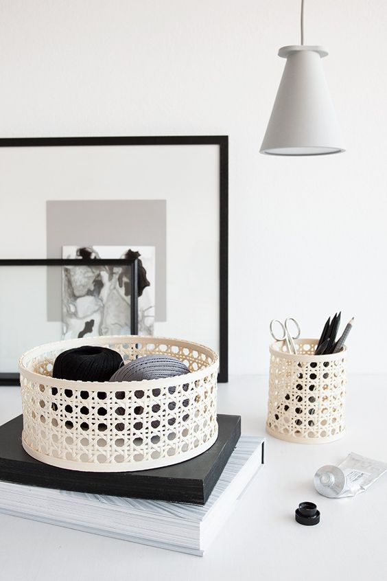 Dans la salle de bains, le bureau ou la cuisine, achetez quelques pots en cannage dans lesquels vous pourrez ranger vos affaires.