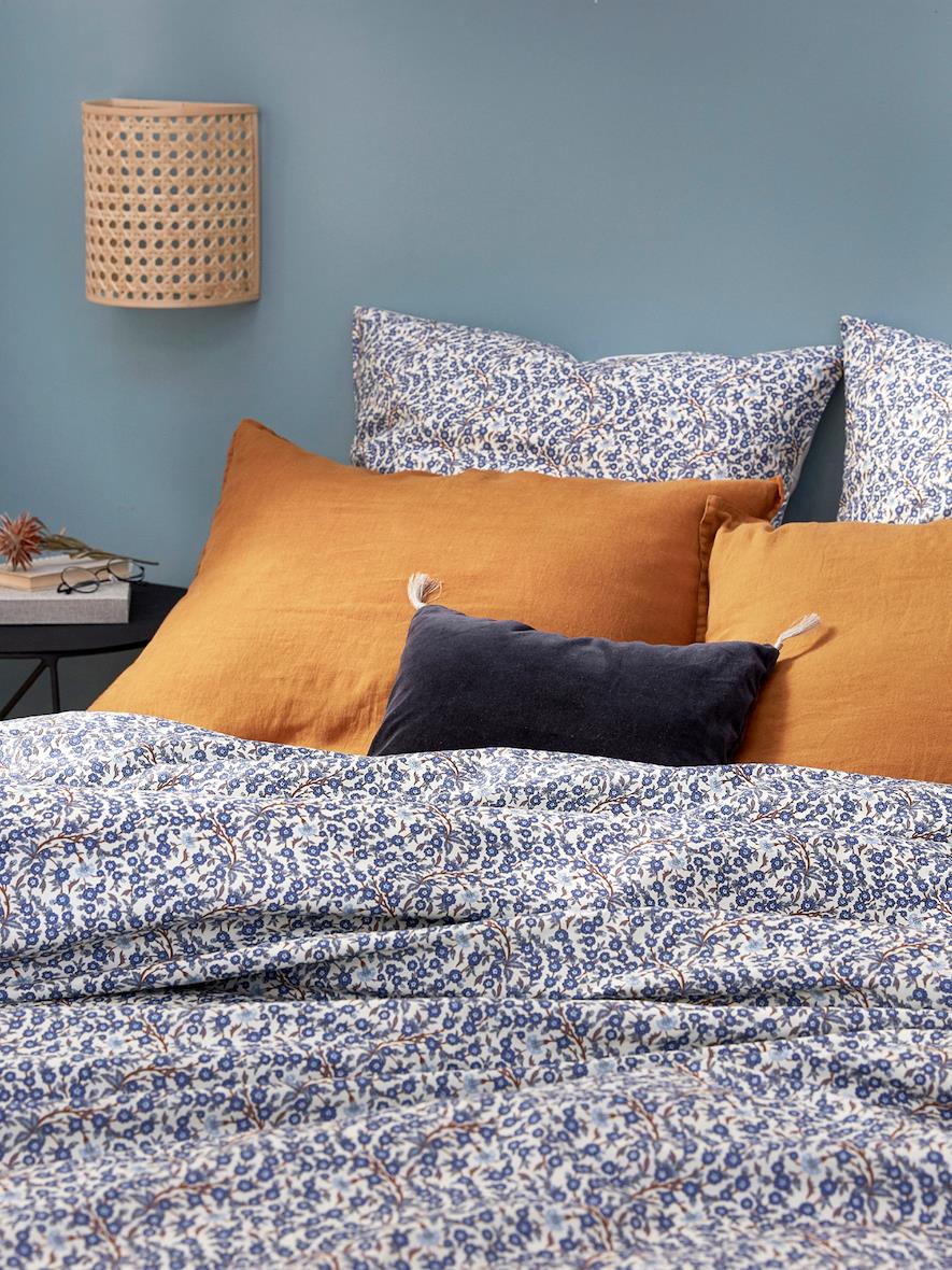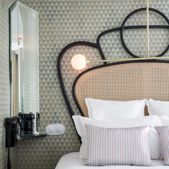 Ambiance tropicale & Art Déco dans cette chambre aux teintes classiques. Les cercles en cannage assemblés en tête de lit apportent ici une touche d’originalité. Ils mettent également en valeur aussi bien le linge de lit en lin classique que la tête de lit en papier peint panoramique.