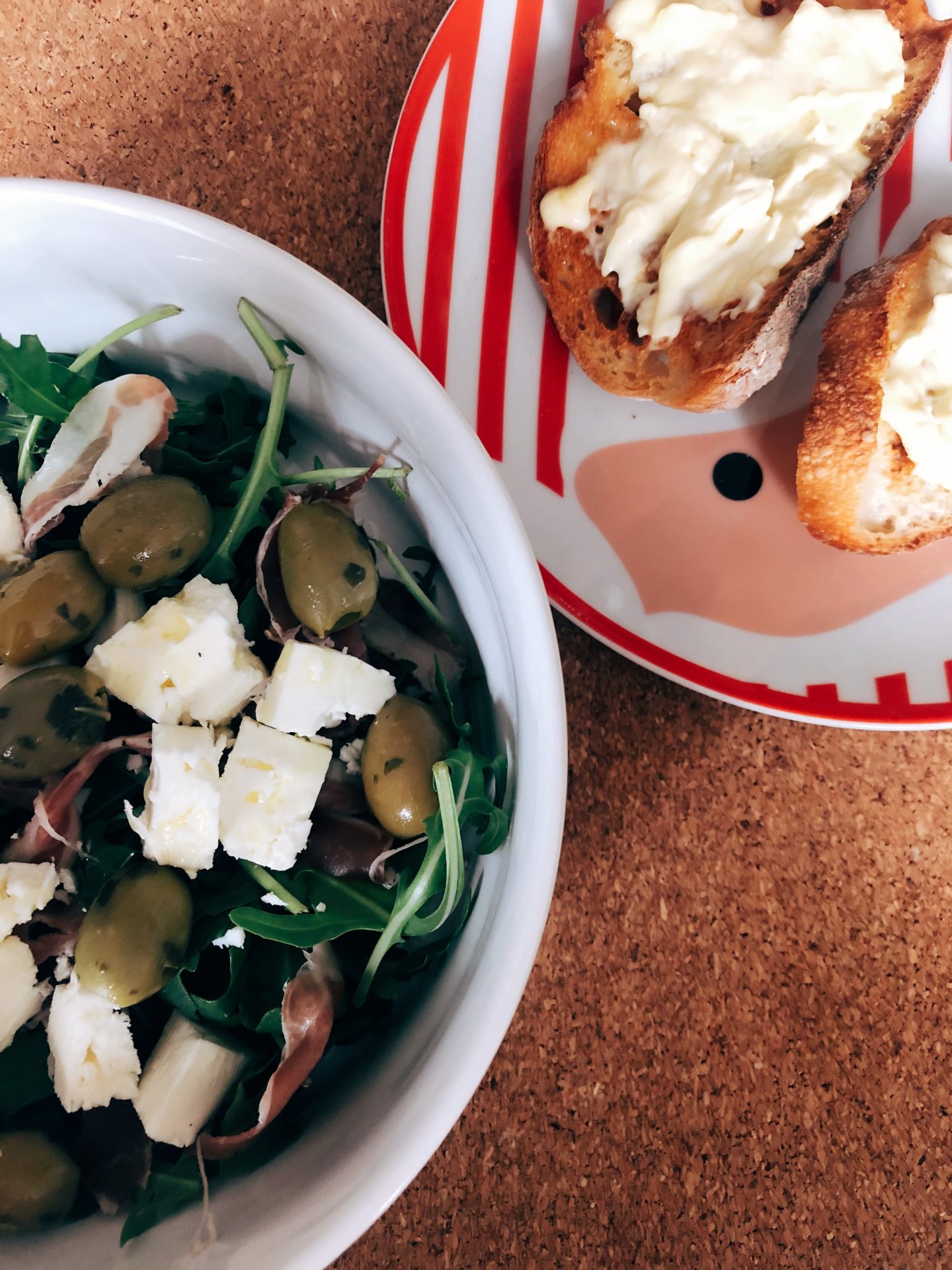 Pour le déjeuner, je n’ai pas super faim donc je me fais une mini salade de roquette fêta et coppa, que j’accompagne de tartine de Saint Félicien.