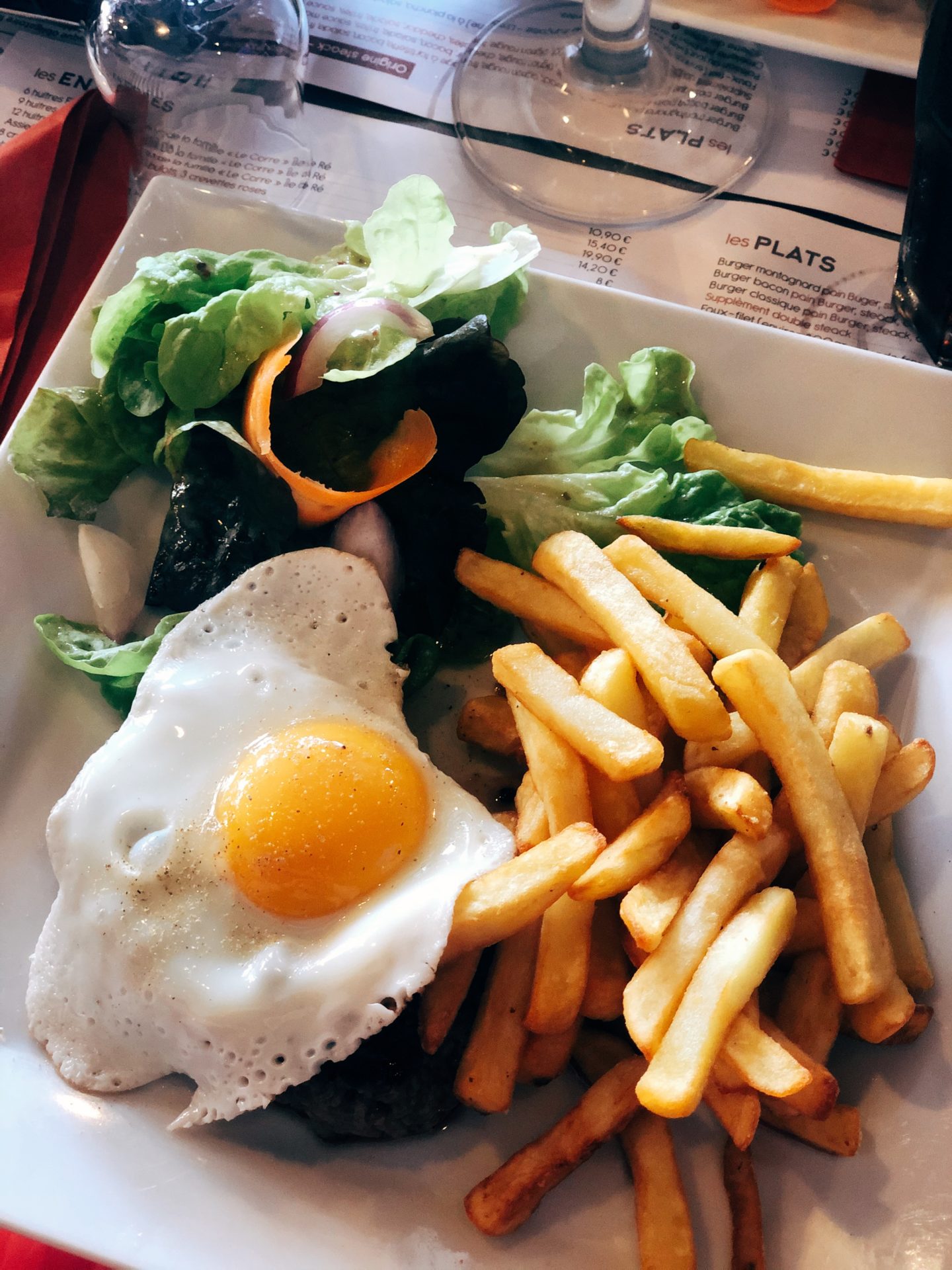 Pour le déjeuner, on décide de se faire un resto en amoureux. J’opte pour un steak à cheval (le truc que je pense jamais à faire à la maison…) et je suis tellement calée que je zappe le dessert.