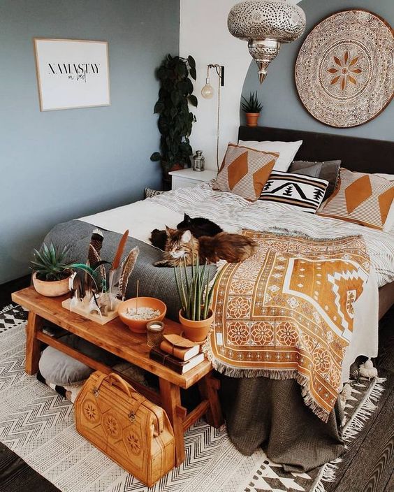 Le style boho convient très bien à l’aménagement d’une chambre à coucher. Ses matières cocooning et ses couleurs souvent neutres (crème, noir, blanc, gris, marron…) permettent de créer une ambiance propice à la détente.