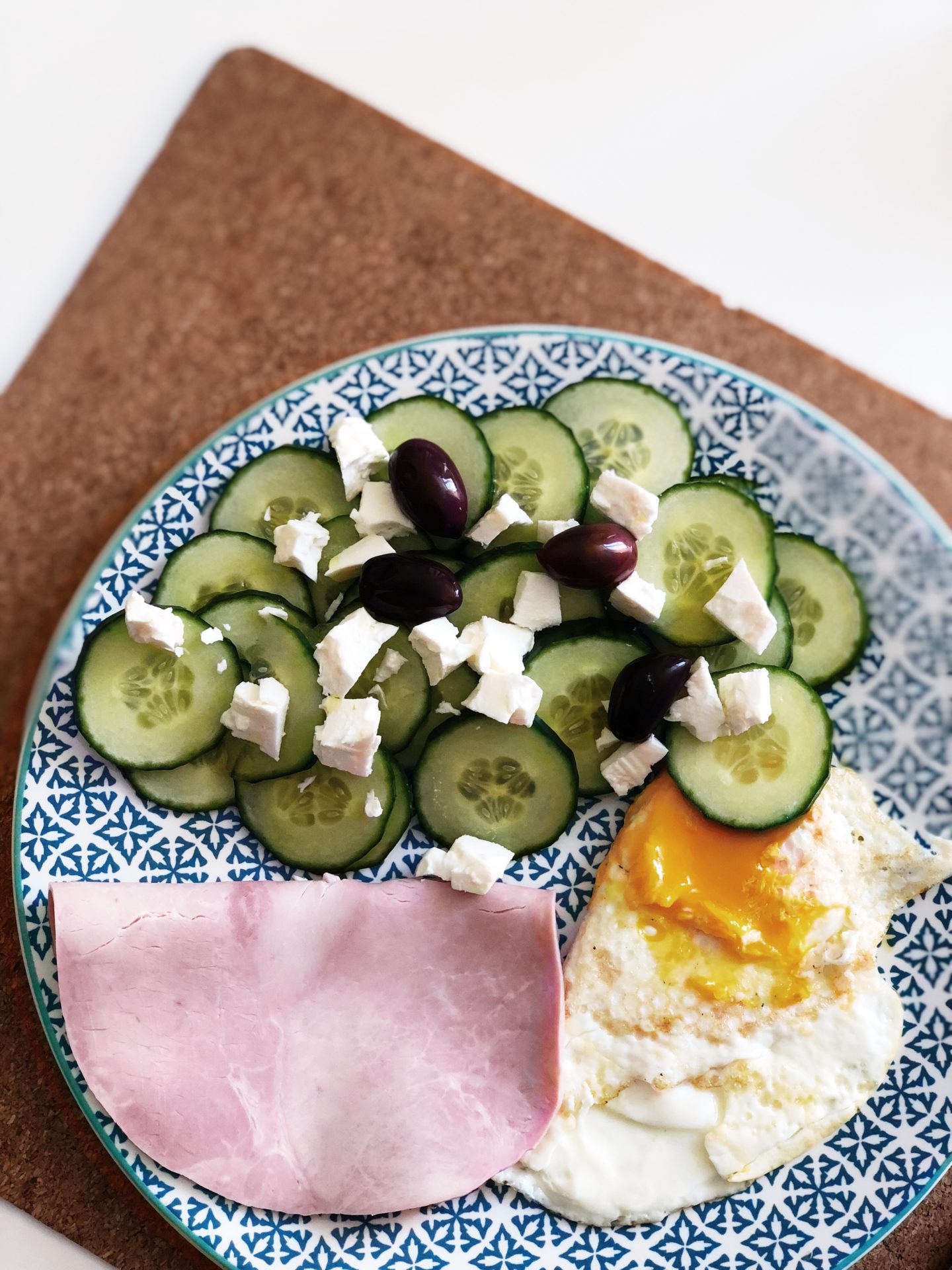 Je travaille comme à mon habitude jusqu’à 13h environ. Pour le déjeuner, je me fais une assiette avec des oeufs, du jambon blanc, du concombre, de la fêta et des olives.