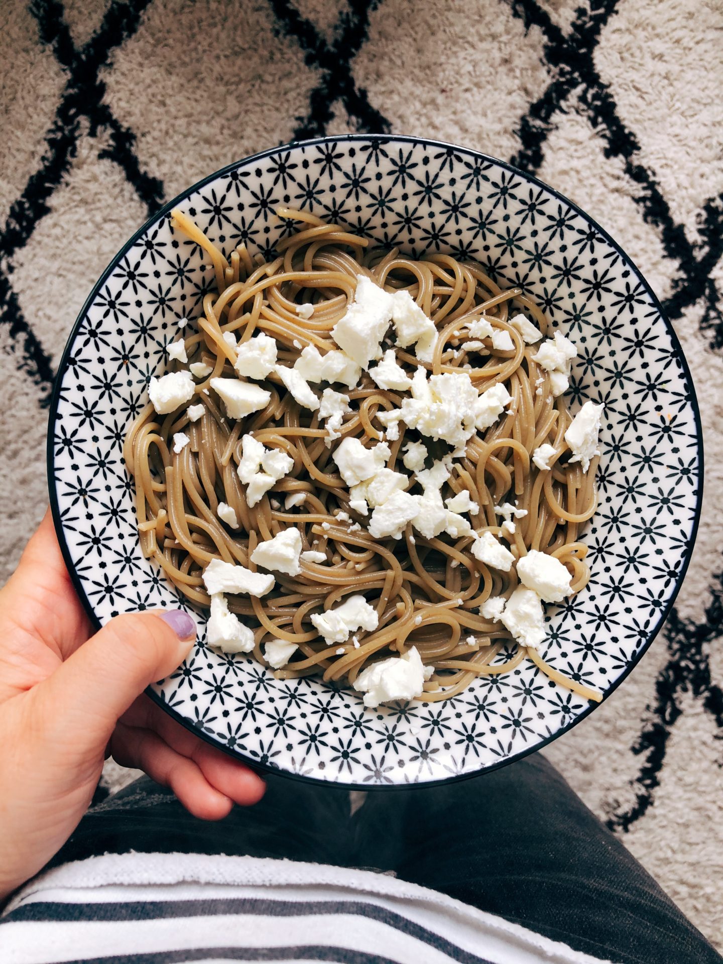 Je me mets à travailler toute la mâtinée, en buvant pas mal de thé vert. Pour le déjeuner, je me cuisine des pâtes à l’ail et au basilic, auxquelles j’ajoute de la fêta et du blanc de dinde.