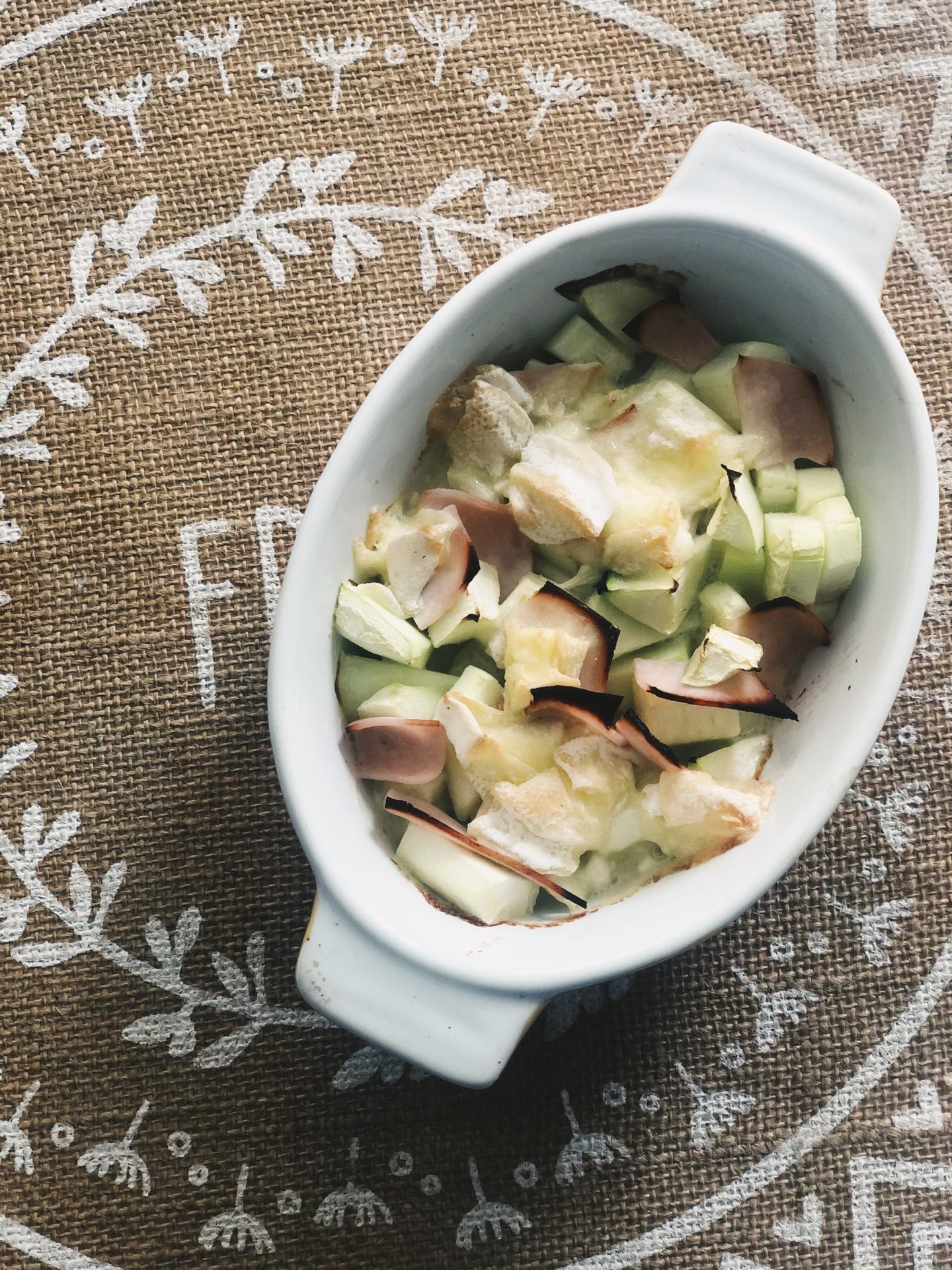 Pour le déjeuner, je me prépare un petit gratin de courgettes au blanc de dinde et au chèvre (rocamadour). Je n’ai pas très faim donc le petit plat me convient très bien.
