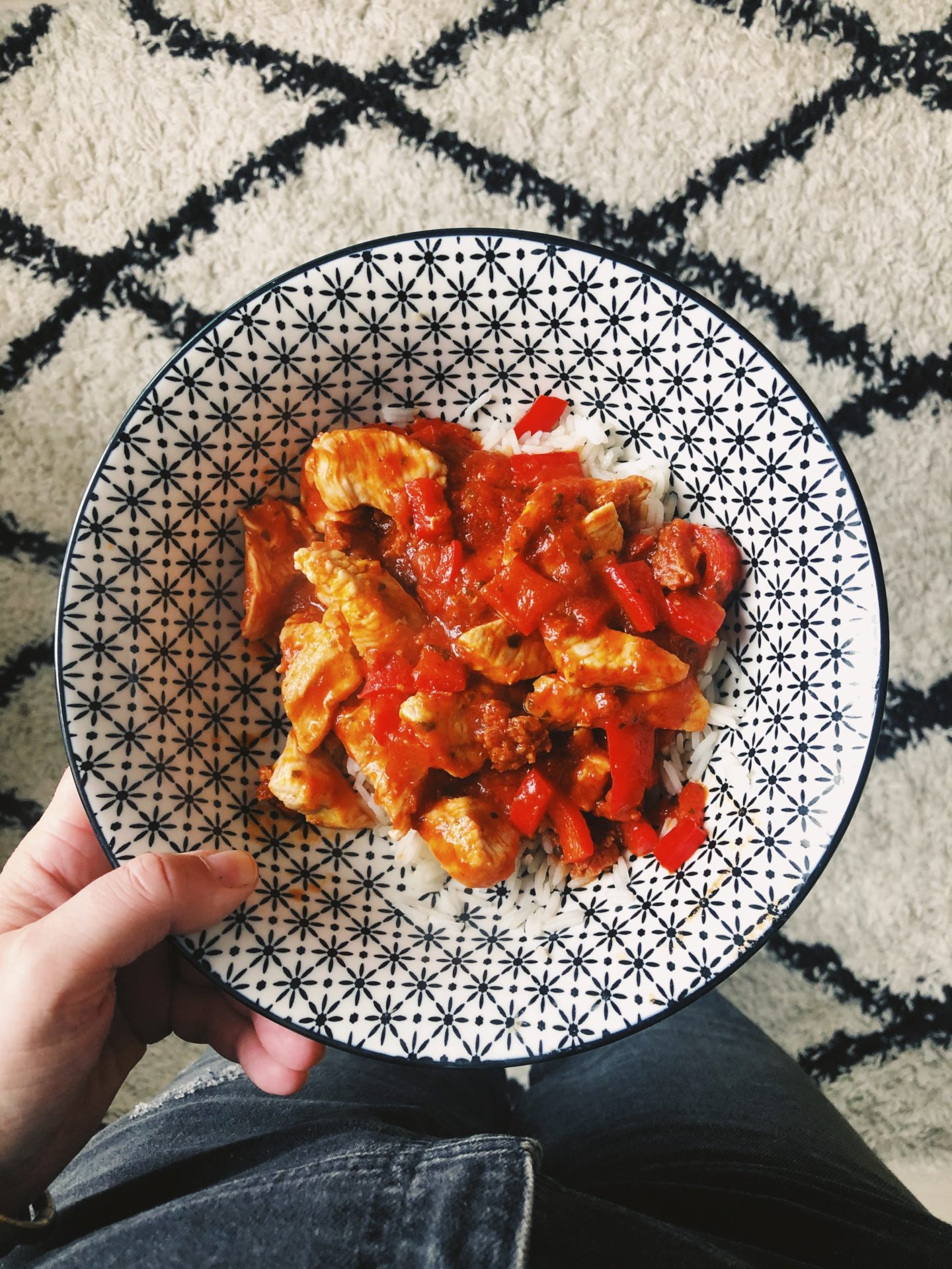Je me lève vers 9h car il faut aller faire les courses (et clairement je déteste faire les courses le samedi ^^). Pour le déjeuner, je prépare un poulet façon basquaise (avec chorizo, poivrons et tomates) que je sers avec du riz.