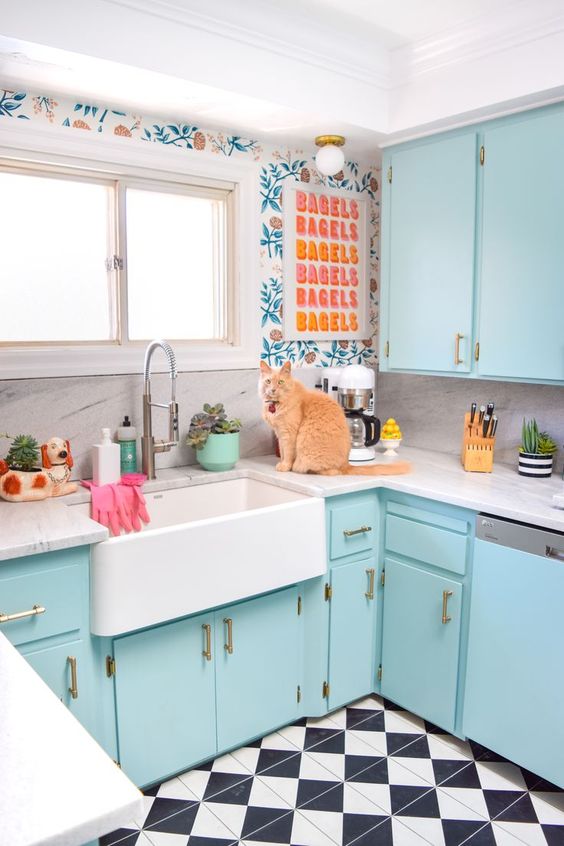 Les couleurs pastels sont très utilisées dans les cuisines rétro. On retrouve très souvent du bleu ciel ou du rose poudré, mais aussi des teintes vertes ou jaune pastel.