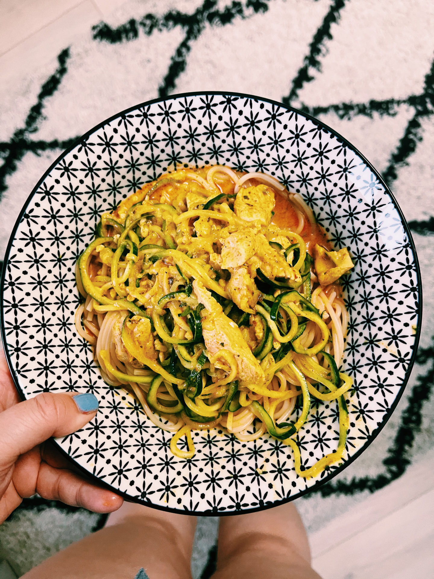- Escalope de dinde, spaghettis et courgettes au lait de coco & curry (soir)