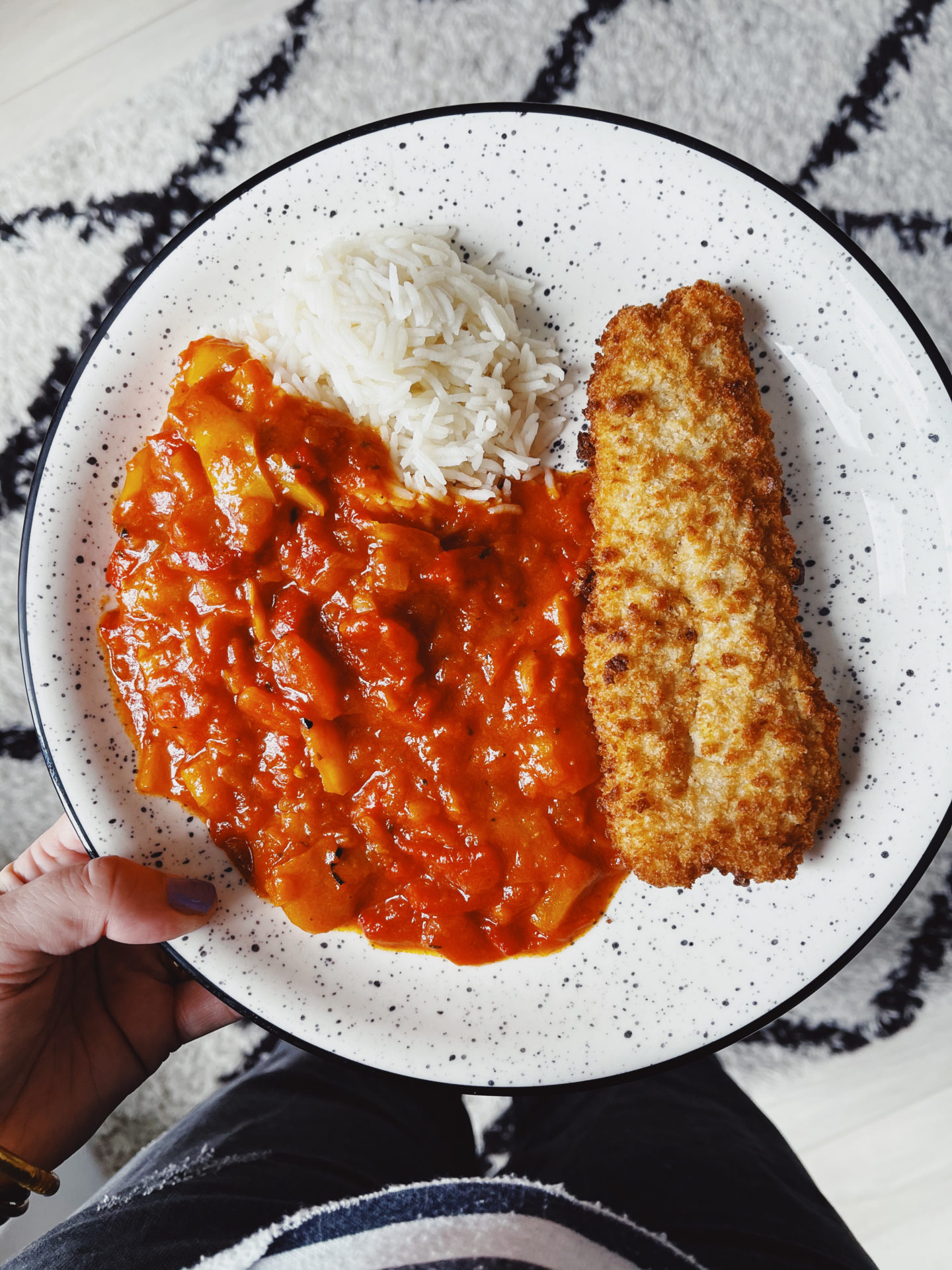 - Poisson pané + riz basmati + poivrons au piment d’Espelette (midi)