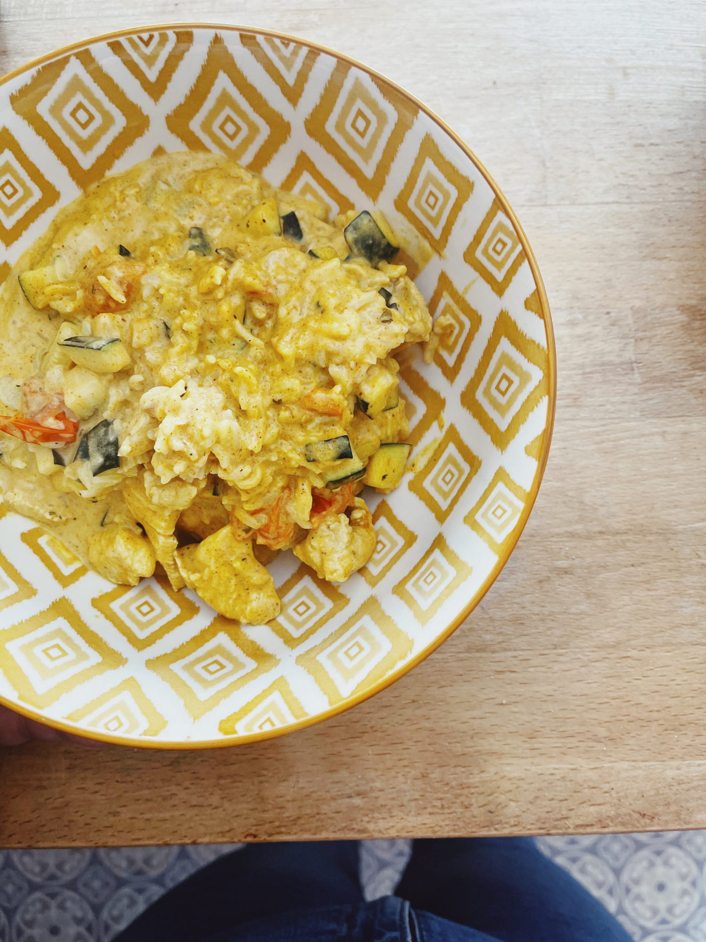 - Poulet au curry, courgettes, tomates et reste de riz basmati (midi)