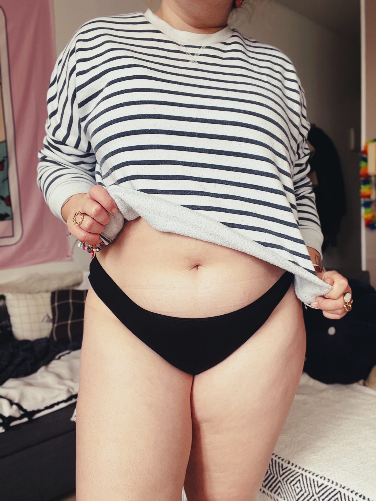 La culotte monte un peu plus haut au niveau du ventre, ce que j’apprécie particulièrement. En effet, j’ai du ventre et j’ai souvent ce que j’appelle l’effet muffin. Un effet pas confortable du tout, parce que j’ai le ventre qui tombe par-dessus le sous-vêtement. C’est d’ailleurs ce que j’ai ressenti avec le shorty, qui est plutôt taille basse.