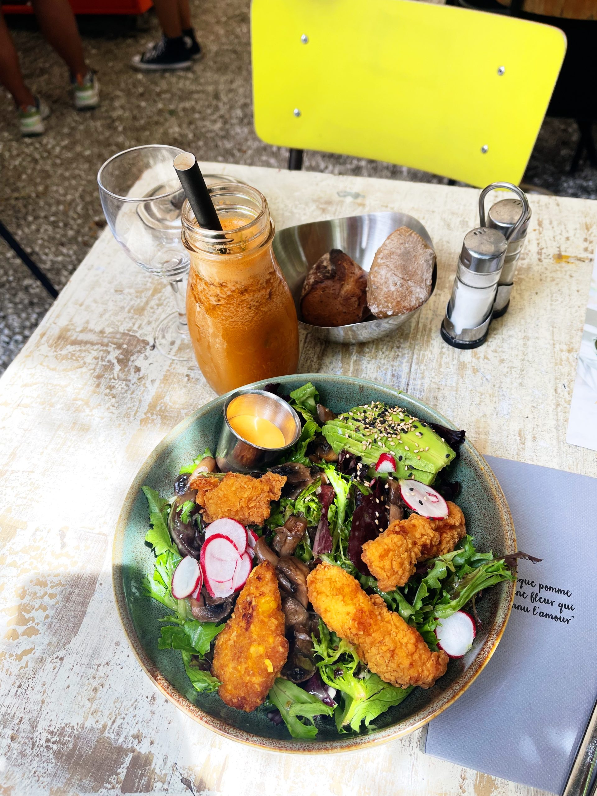 - Déjeuner : Salade au poulet, avocat, radis, champignons de Paris et un jus carotte/ananas/coriandre au Paradis du Fruit