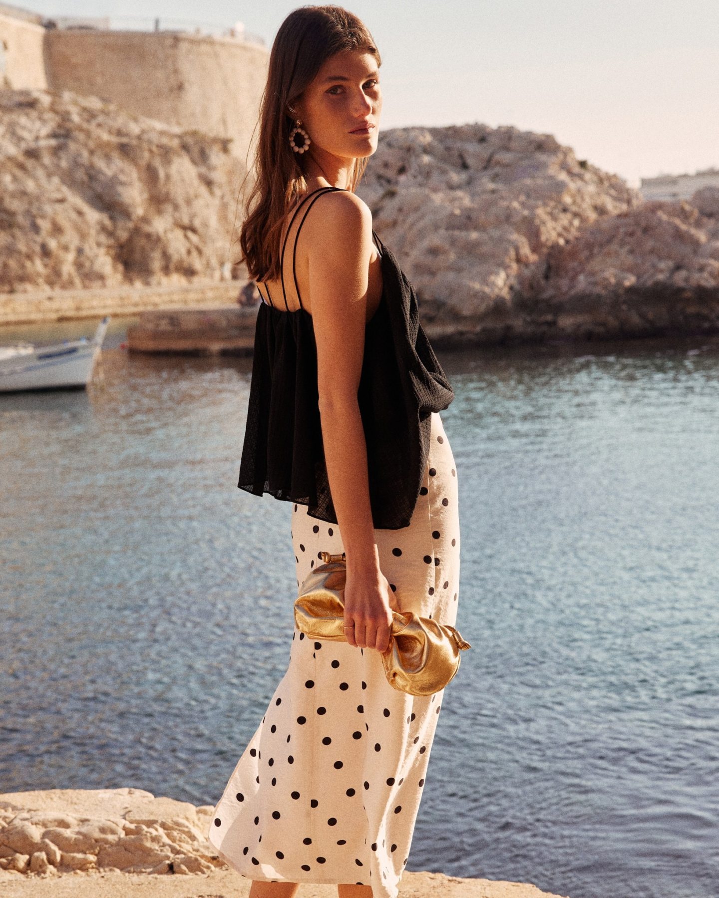 La petite robe noire est un grand classique de la mode ! J’ai un gros coup de coeur pour cette robe évasée, courte, avec le dos légèrement ouvert. Un vrai basique à avoir dans son dressing. Vous pouvez même la porter pour une soirée chic, en l’associant à une jolie paire de sandales et quelques bijoux dorés.