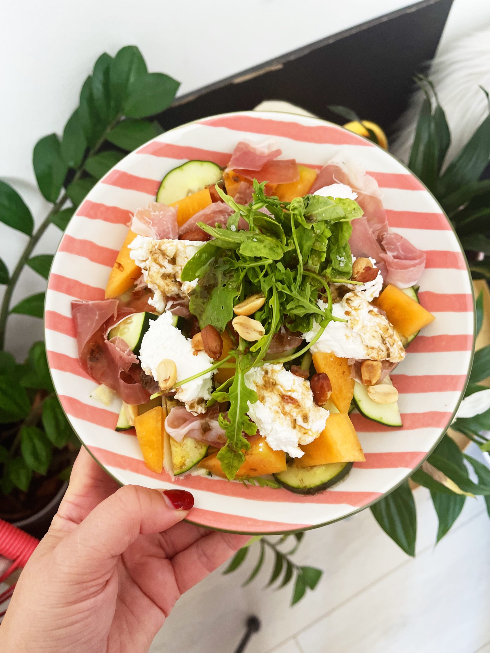 - Déjeuner : Soupe de pastèque + une salade carotte, concombre, pastèque, jambon cru, burrata… de chez Cassius