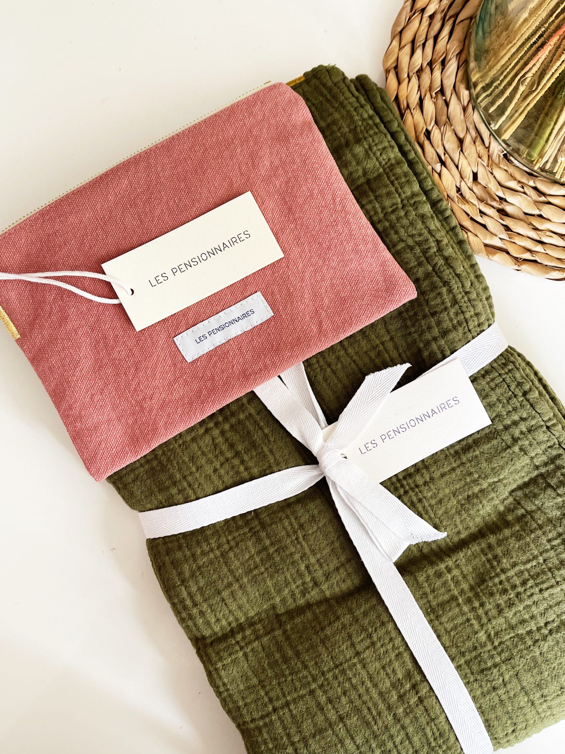 J’ai donc jeté mon dévolu sur leur plaid en double gaze de coton. On peut l’utiliser comme plaid, mais aussi comme drap de plage, nappe ou bien encore jeté de lit. J’ai choisi un joli vert câpre, très tendance cette saison.
