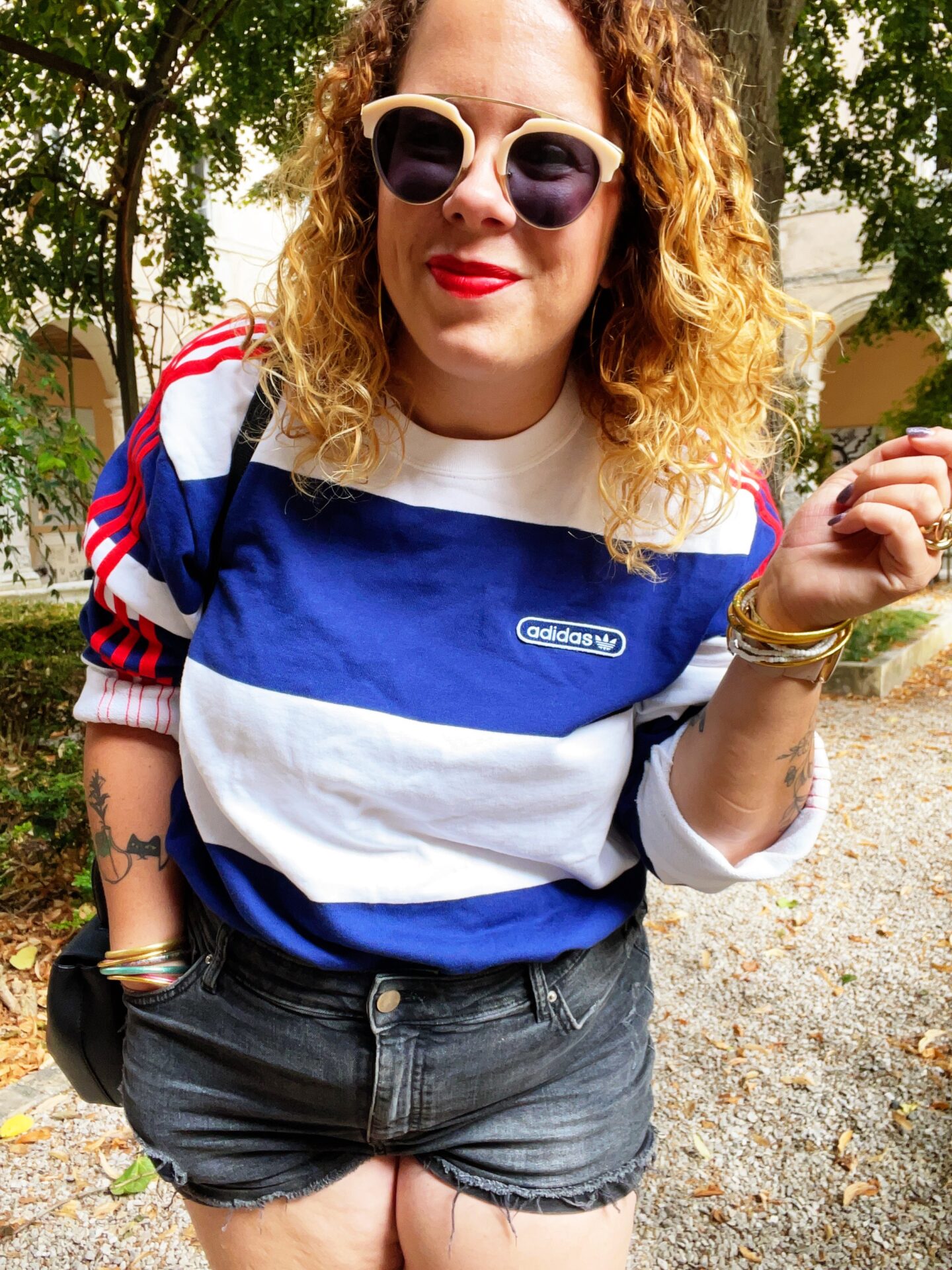 J’adore le porter avec mon short en tweed rouge, pour créer un look casual chic. Aux pieds, mes nouvelles Stan Smith à plateforme pour gagner quelques centimètres et atteindre 1m60 sans efforts ! Je les adore, même si je trouve que la marque taille plus petit qu’avant. J’ai en effet d’autres modèles de Stan Smith en 36 achetées depuis des années qui taillent moins petit.