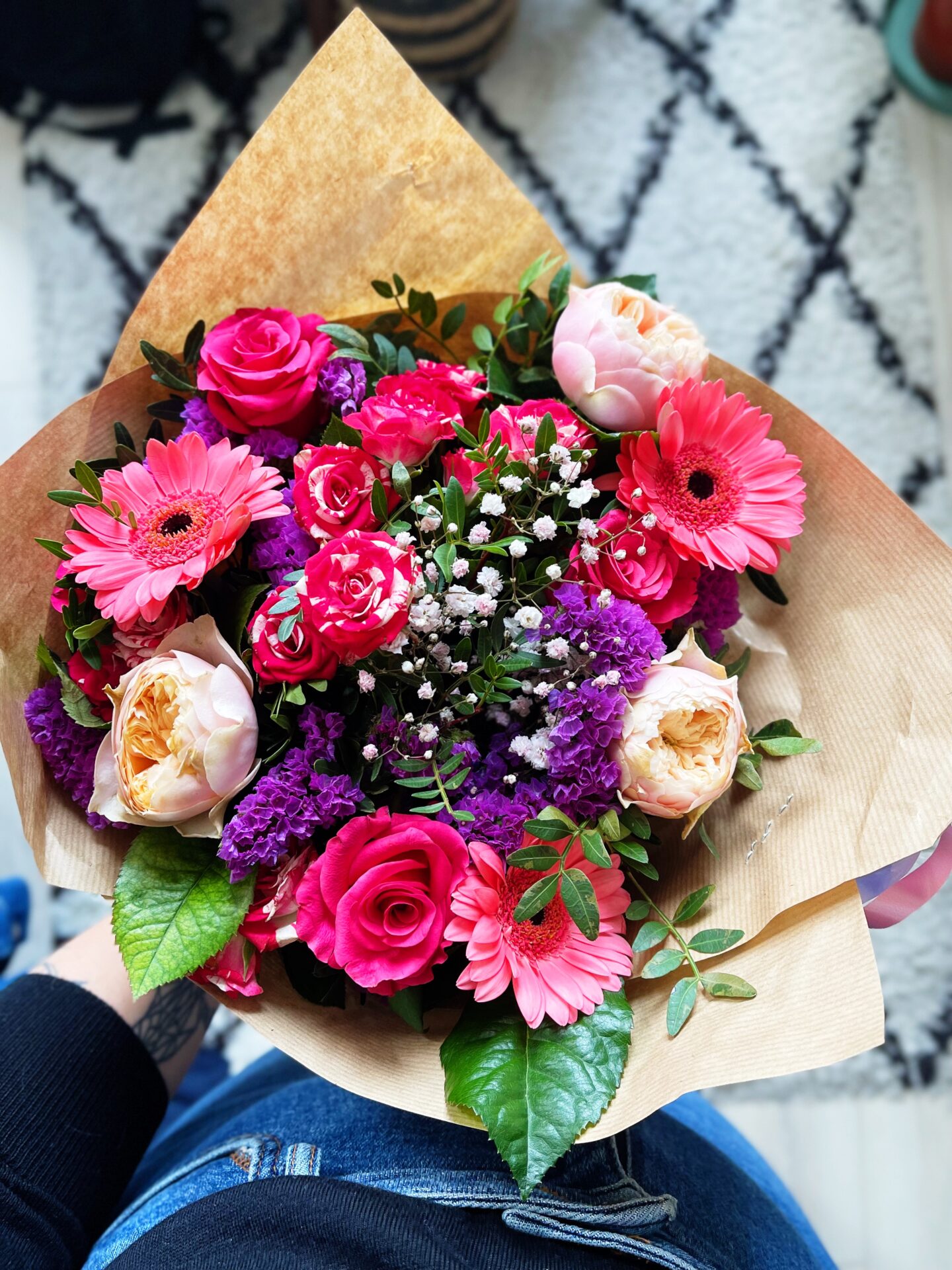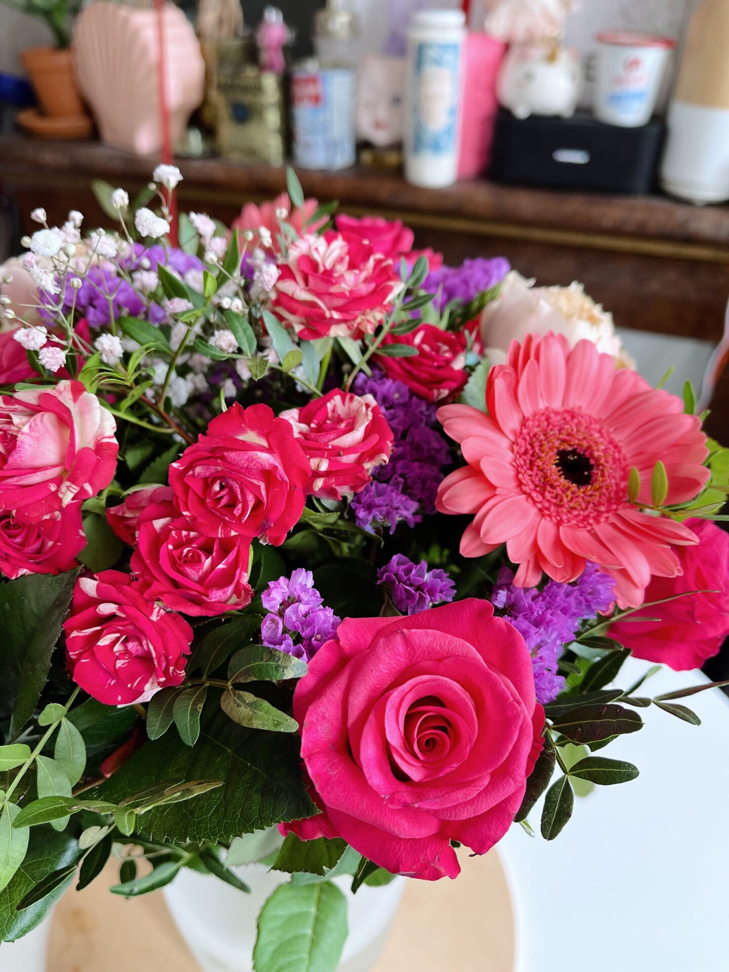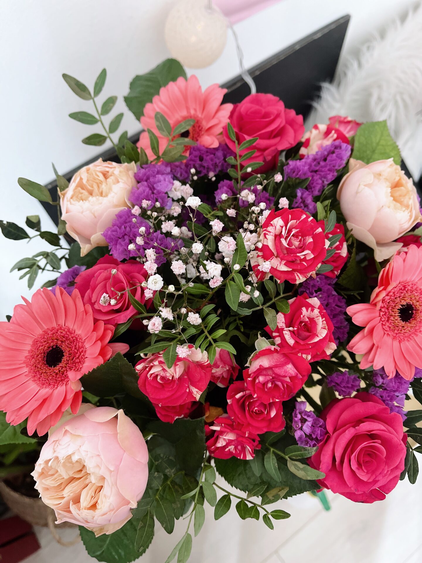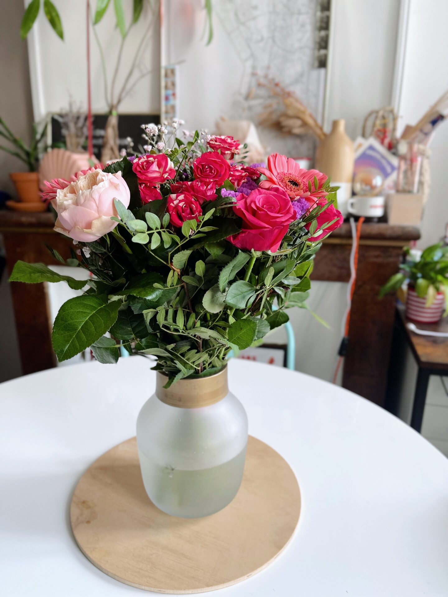 Dans mon bouquet, on retrouve donc des germinis, des roses et des pivoines. J’adore ces fleurs et ce magnifique bouquet est venu mettre de la couleur dans mon salon !