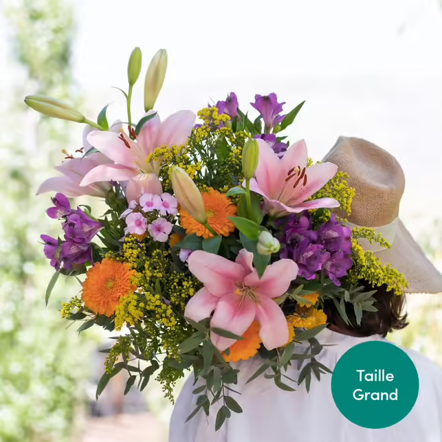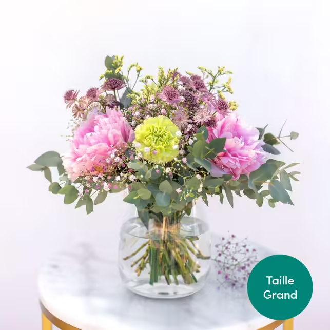 Bien garni, ce joli bouquet est le juste équilibre entre notes poudrées, rose et pêche, empreintes de tendresse et fleurs fuchsia. Un bouquet plein de gaieté et de peps !