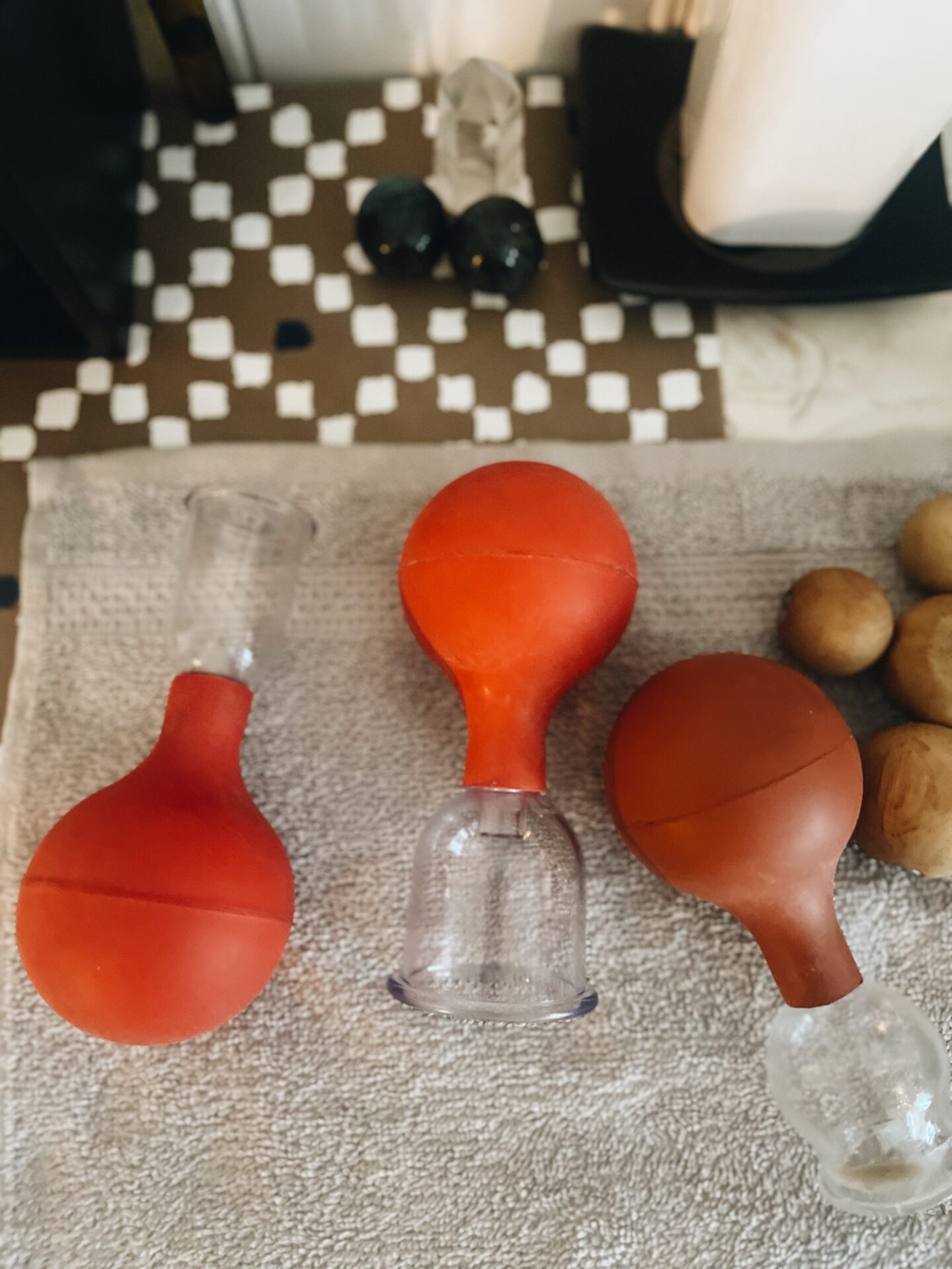 Puis Florence vient commencer à me masser le ventre. Le problème, c’est que mon ventre est tellement dur et crispé qu’elle a bien du mal à le détendre en utilisant seulement ses mains et des huiles. Elle décide donc de s’aider de ventouses pour commencer à détendre tout cela. Alors, rassurez-vous, ça ne laisse aucune trace et ce n’est pas trop douloureux. Je dis « pas trop », car selon les zones, je ressentais les tensions plus intensément qu’à d’autres.
