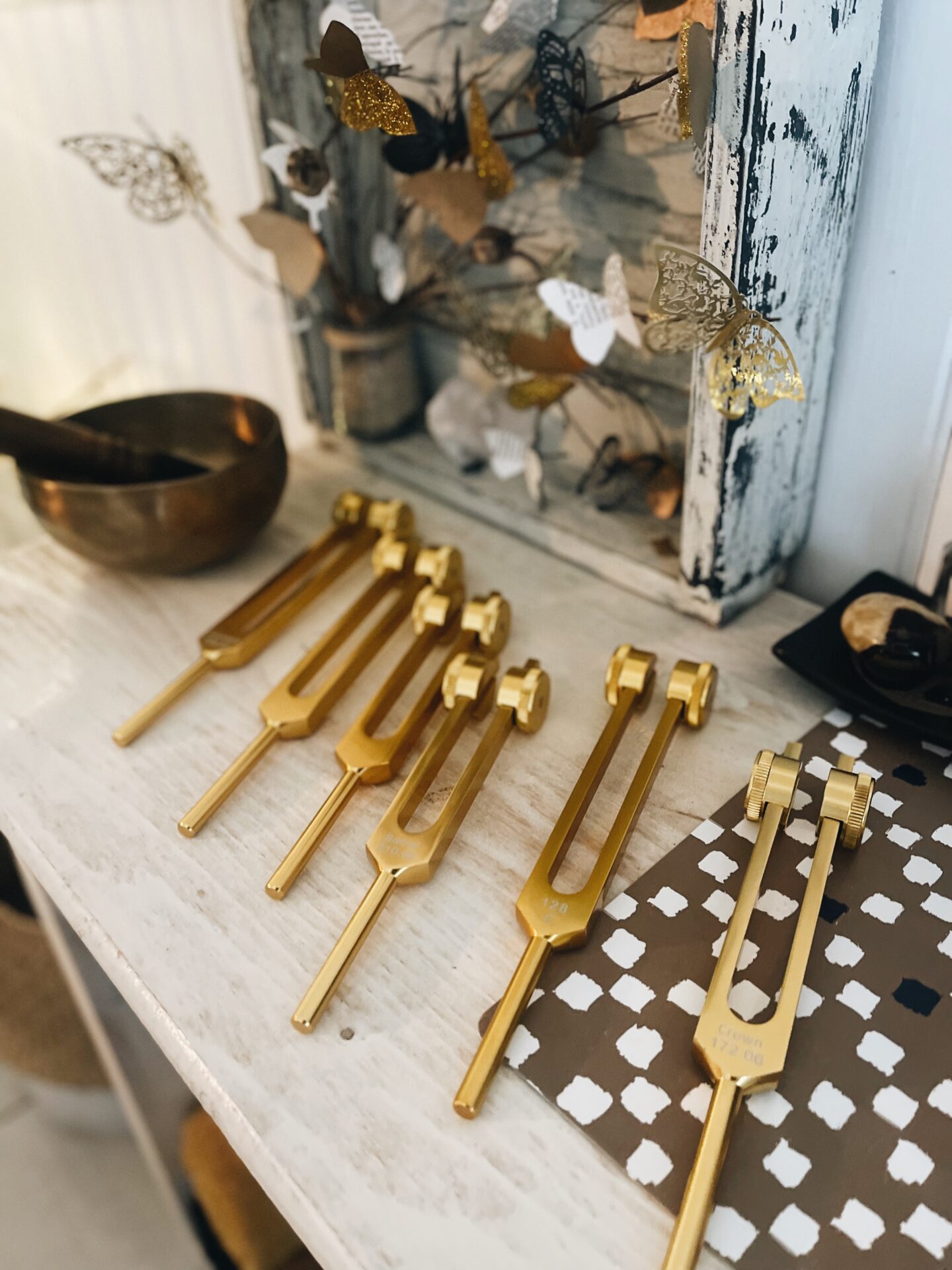 Florence utilise également des diapasons. Ces diapasons thérapeutiques aident à rééquilibrer les chakras. C’est un des outils utilisés pendant la séance pour débloquer les noeuds et permettre aux énergies de recirculer petit à petit. Cela aide aussi le mental à se détendre et à lâcher prise.