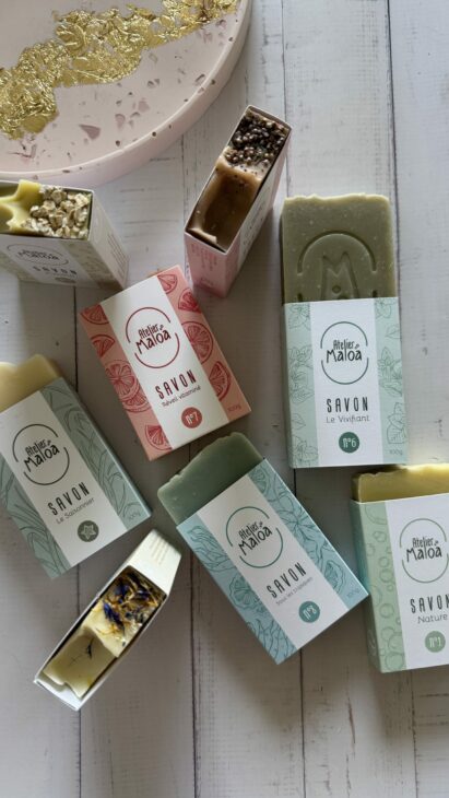 Le premier amour de Jessica, ce sont les savons. C’est d’ailleurs grâce à sa passion des savons que Jessica s’est lancée dans la création d’Atelier Maloa. Elle propose donc une gamme de savons doux pour la peau et pour la planète, riches en glycérine naturelle.